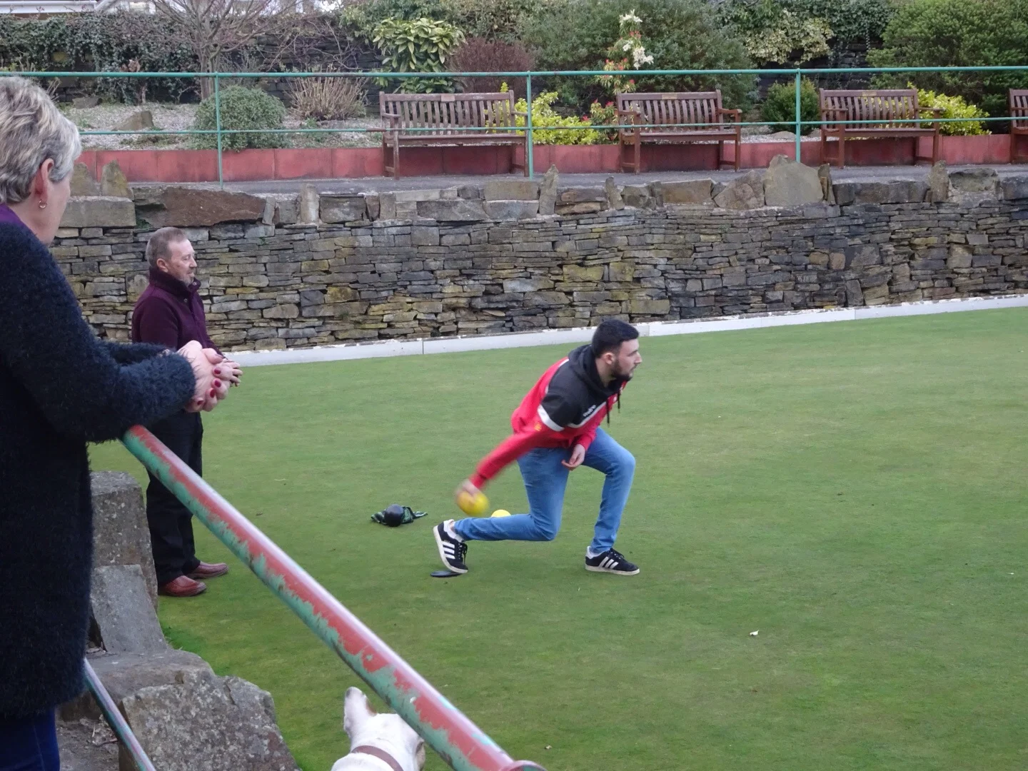 Malcom Thorpe played well. He had a cracking and long game v Chris Greenwood winning 21-20. He then came up against new member Simon Leeming ( without shorts - it must have been cold!). Malcolm led Simon 15-10 after being 10-5 down. Simon then had a run to lead 17-15. Malcolm hit back then to lead 19-17 but lost the jack to Simon. One telling end saw Simon next to the jack and Malcolm's first ball past the jack. Simon then had to hold his breath as Malcolm so nearly produced a match winning last wood, narrowly missing the jack which would have pushed the jack onto his through bowl to count game with a 'doublaaaay'. Simon then victor 21-19.